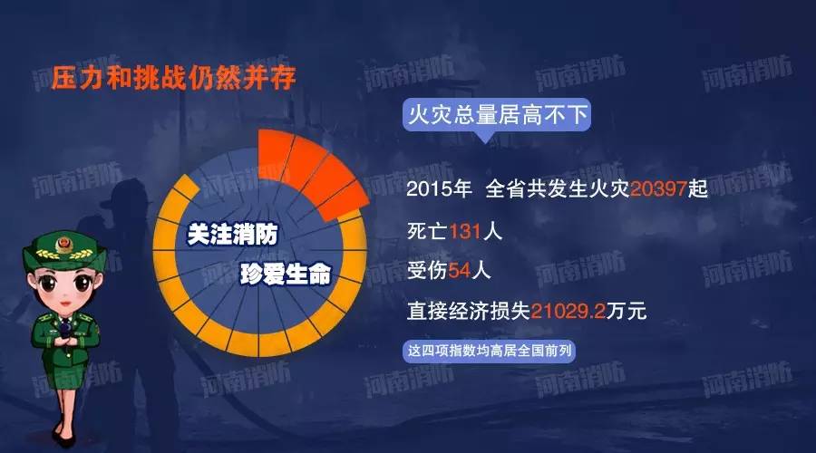 他指出,2015年,全省连续发生了平顶山鲁山县“5.25”特大火灾事故,郑州市“6.25”重大火灾事故损失惨重,教训深刻,消防工作形势面临历史“冰点”;为改变火灾形势十分严峻的局面,按照省委、省政府“三查三保”统一部署,全省各级、各部门深刻汲取教训,痛定思痛,举一反三,扎实开展消防安全专项治理行动,全面落实“大约谈、大曝光、大执法”,共检查社会单位163.4万家,督促整改火灾隐患214.1万处;通过各级、各部门大量艰苦细致的工作,实现了火灾形势的逐步好转。下半年,全省发生火灾8358起,死亡39人,其中,较大以上火灾事故4起,死亡13人,同比分别下降20%、48%,特别是圆满完成上合首脑会议消防安全保卫任务,实现了涉会场所不冒烟起火,重点部位不发生火灾事故,全省不发生较大以上火灾事故的既定目标,为上合会议的胜利召开创造了良好的消防安全环境。