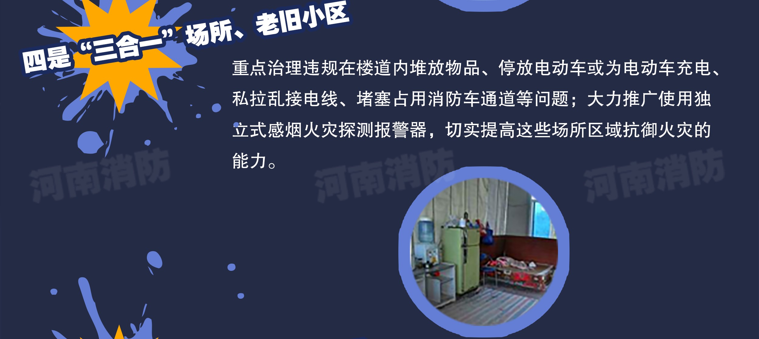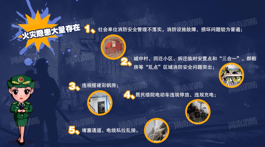 火灾隐患大量存在。社会单位消防安全管理不落实,消防设施故障、损坏问题较为普遍;城中村、回迁小区、拆迁临时安置点和“三合一”、群租房等“乱点”区域消防安全问题突出,违规搭建彩钢房、居民楼院电动车违规停放、违规充电、堵塞通道、电线私拉乱接等问题尚未得到根治,火灾隐患整治、反弹,再整治、再反弹;社会消防法治意识依然淡薄,消防违法违规行为仍呈高发、多发态势,建筑工程未审核先建设、未验收先使用的问题还比较突出。同时,一些火灾隐患整改难度大,还有大量的隐患存量,去年各级政府挂牌督办的重大火灾隐患仍有105处没有整改到位。